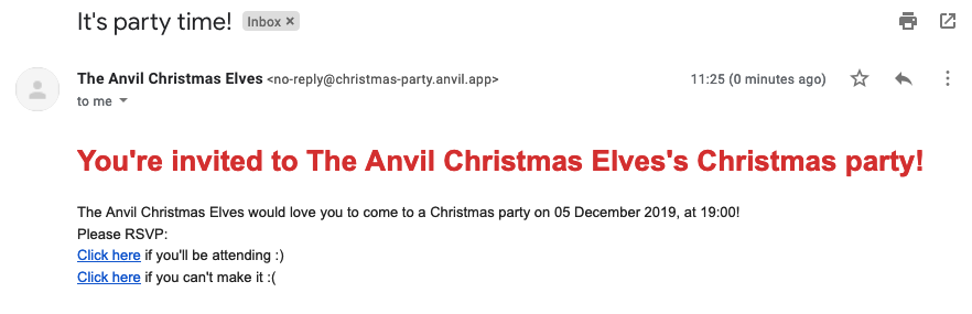 anvil.server.call('rsvp', party, respondent, rsvp)Now, your host will get an email each time they receive an RSVP!