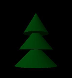 I’m making my tree out of three ConeGeometry objects – although they’re Javascript objects, we can construct them straight from Python. Here’s the code fragment that actually builds the tree: