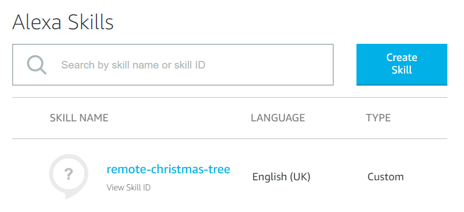 Firstly, you’ll need an Amazon Alexa device of some description. She hides in everything these days, so you’ve probably already got one - here’s a good way to find out. Make sure the device is registered to your Amazon account, then head to the Alexa Developer Console and create a new Skill. I called mine remote-christmas-tree.