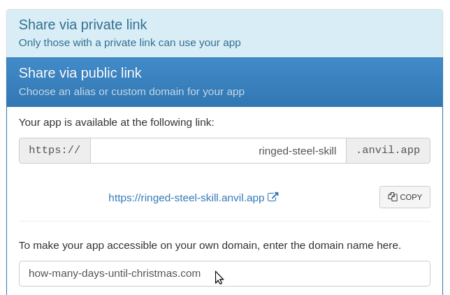 I used Amazon Route 53 to register how-many-days-until-christmas.com, then I followed the DNS settings guide to point it at my Anvil app: