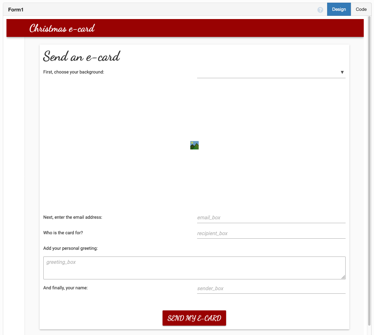 Back in the UI, we’ll use a DropDown component to let our users choose the background image for their e-card. We’ll also show a preview of the selected image using an Image component.