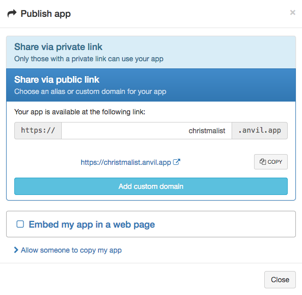 The app is published at christmalist.anvil.app - go ahead and use it to streamline your present-receiving this year!