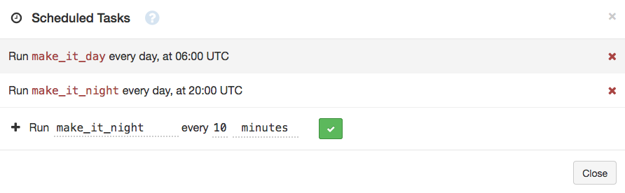 anvil.server.call('set_color', 255, 255, 255, 31)The arrival of sunset and sunrise are orchestrated by two Scheduled Tasks:
