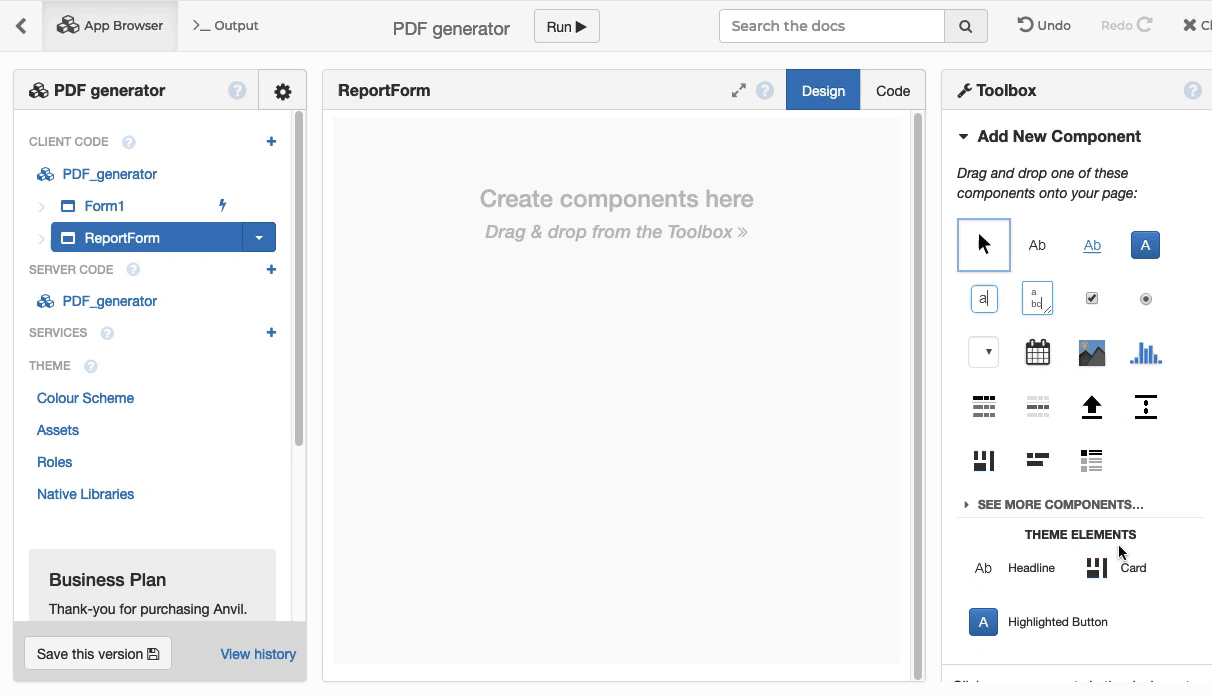 To design our PDF, we first open the Anvil cloud editor, and create a new app, choosing the ‘Material Design’ theme. We’ll want to create a “Form” - that’s a piece of web UI - which we will then turn into a PDF.