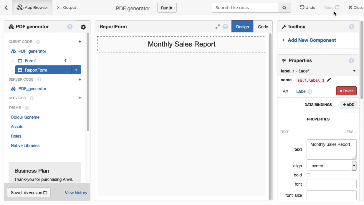 pip install anvil-uplinkAnd then we paste that connection code into our script, and add code to create a PDF file: