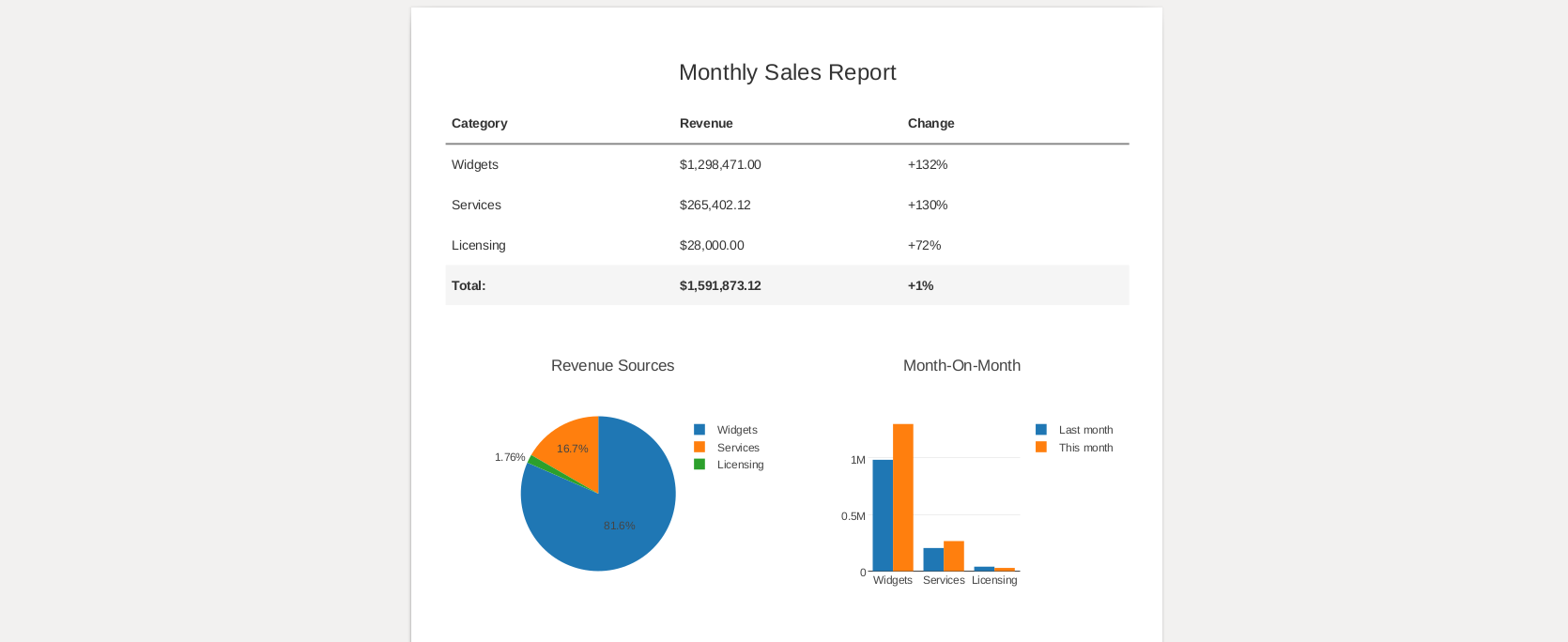In this example, we’re going to take two CSVs, representing sales data from this month and last month, and create a PDF report that looks like this: