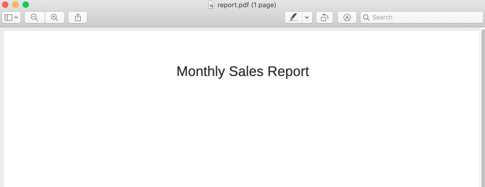 anvil.media.write_to_file(pdf, "report.pdf")Now we run this code. Anvil will produce a PDF, containing just our title.
