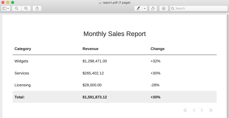 self.data_grid_1.add_component(total_row)Voila! Our table is looking spiffy. If we run our script, we get this PDF: