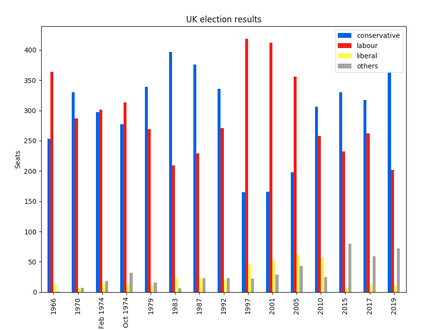 Each of these libraries takes a slightly different approach. To compare them, we’re going to make the same plot with each library, and show you the source code. I’ve chosen a grouped bar chart of British election results since 1966. Here it is: