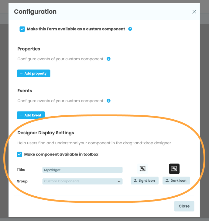 Once you make a Form into a custom component, you can configure how the component will appear in the Toolbox.