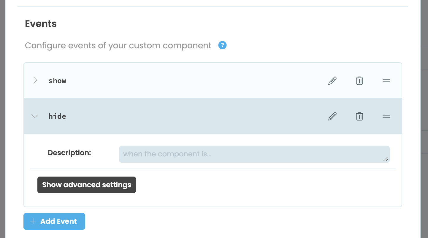 Just like regular Anvil components, custom components have show and hide events already built in. The show event is triggered when the component is shown on the screen and the hide event is triggered when the component is removed from the screen. To expose these events, you just need to add them as events in the configuration menu. You do not need to write any code to wire them up.