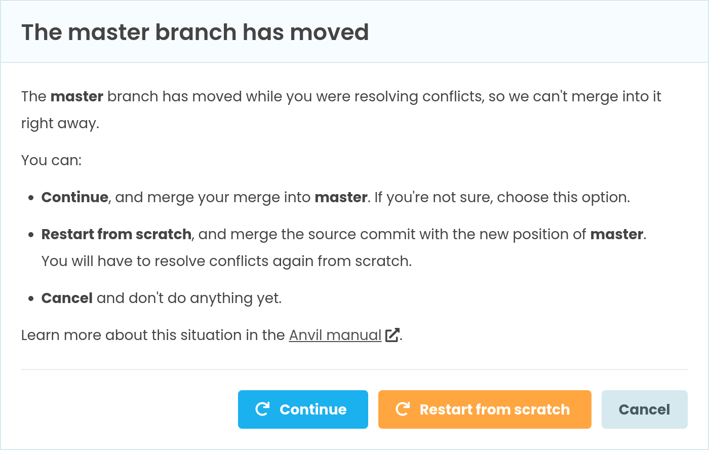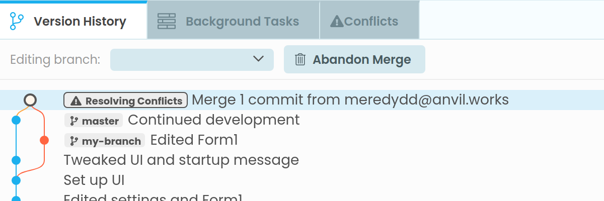 When an attempted merge fails with conflicts, Anvil will notify you with a dialog, and open the Conflicts tab in the bottom panel, which will show you which changes conflicted: