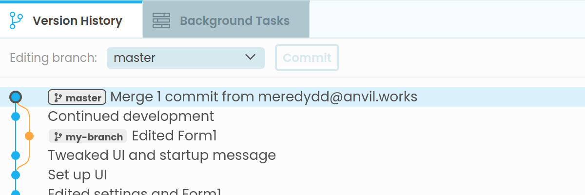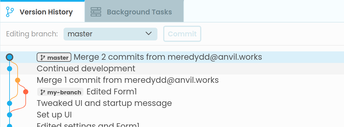 As with component conflicts, in case of configuration conflicts Anvil will choose a side (usually the target branch) and leave those changes in your app’s source code, while displaying the conflicting changes in the Conflicts tab.