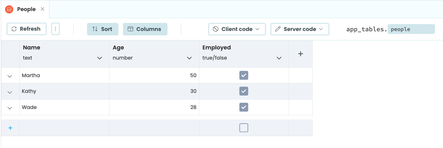 Each table has its own columns. For example, if we are making a table of people for our organisation, we might have columns for name, age and employment status. Each row in the table represents an item - in this case, a person.
