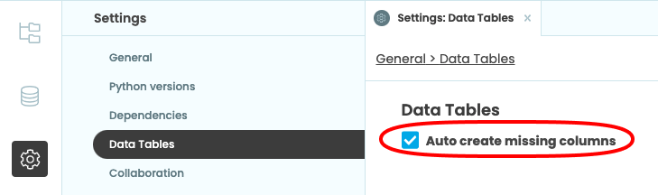 Navigate to ‘Settings’ in the Sidebar Menu, and ensure that ‘Auto create missing columns’ is checked in the ‘Data Tables’ tab.