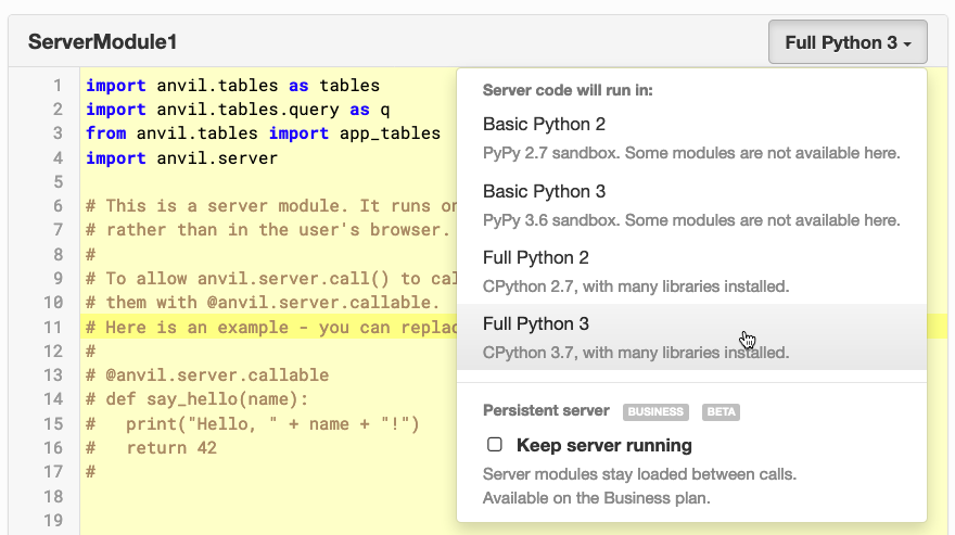 Add a Server Module, and select the ‘Full Python 3’ runtime in the dropdown in top right:
