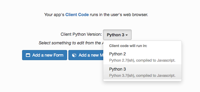 If your app already uses Packages, the Anvil Editor will guide you to a dropdown that allows you to select the client-side Python version. Select Python 3: