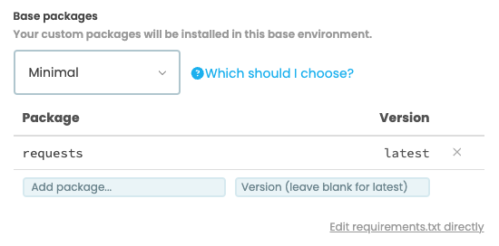 Install the library from the Python version section of your App Settings, or select one of the base environments in which it’s already included.