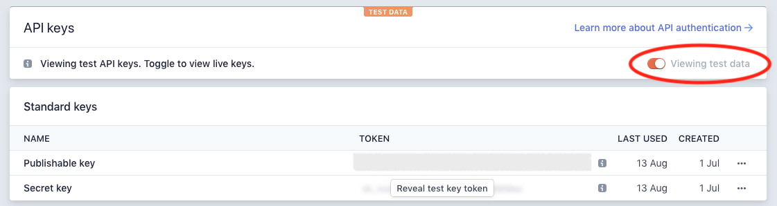 You also have the option to view either your live keys or your test keys using the toggle: