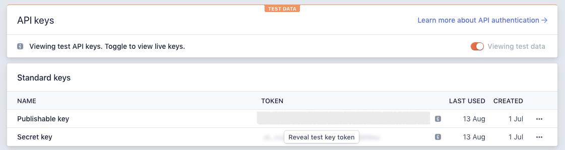 You’ll see a list of ‘Standard Keys’ which includes both your Publishable Key and your Secret key: