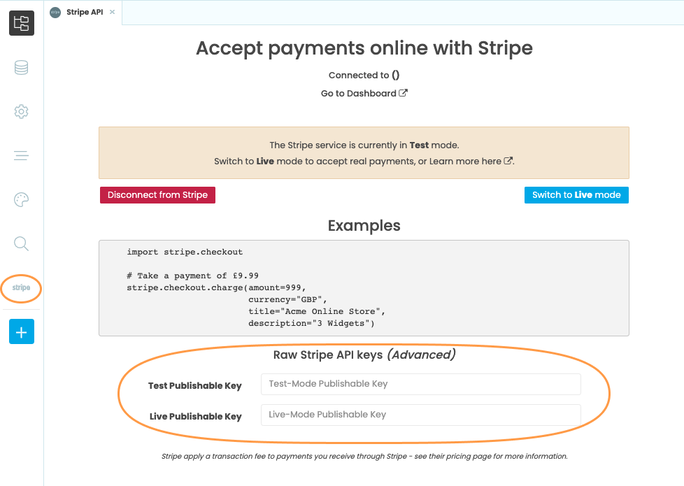 Select ‘Stripe’ from the App Browser, and enter your Test and Live publishable keys in the boxes provided:
