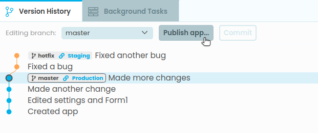 You can also create branches in your app. These are labels that point to a particular commit. Your app starts with a single branch, called master. You can choose which branch you’re editing from the Editing branch dropdown. When you’re editing a branch, that means this branch will move as you edit your app, to point at each new commit as you create it.
