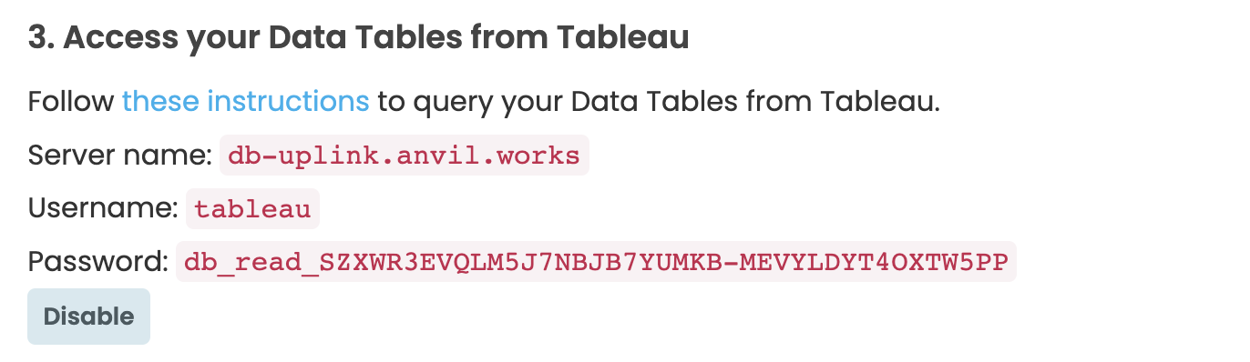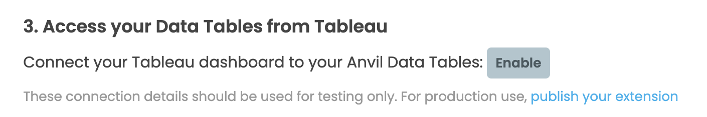 Scroll down to “Access your Data Tables from Tableau”, and click Enable:
