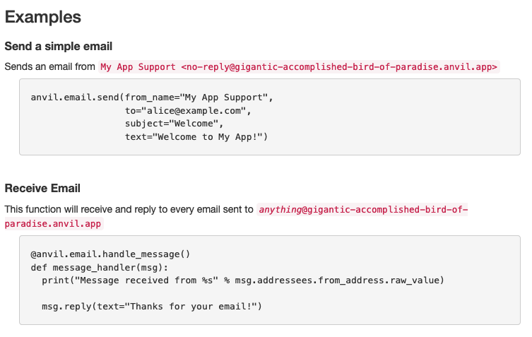 Send and respond to emails with one line of Python using Anvil’s built-in Email service.