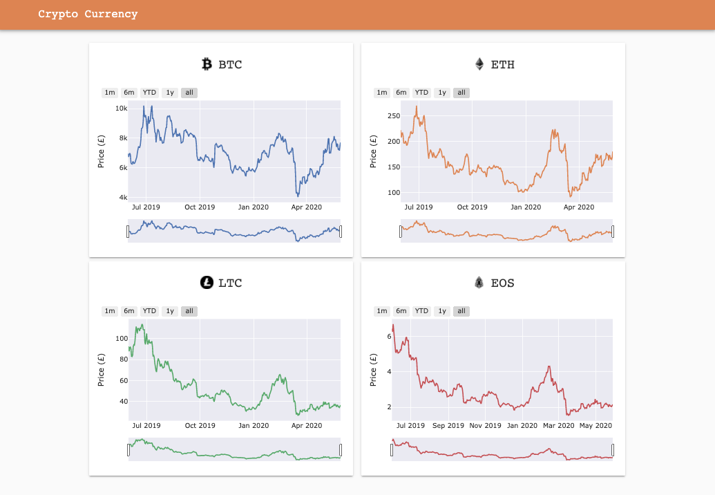 This dashboard template shows exchange rate history for four prominent cryptocurrencies. You can use this template to create your own custom cryptocurrency dashboard.