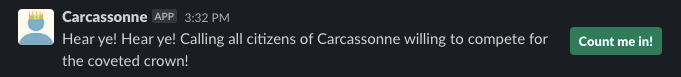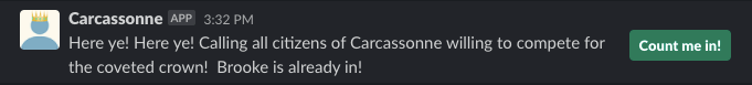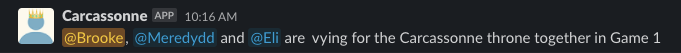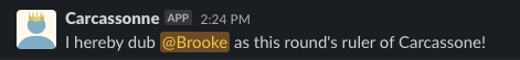 response = client.chat_postMessage(channel="#carcassonne-games", text="I hereby dub " + ", ".join(winner_mentions[:-1]) + "and " + winner_mentions[-1] + "as this round's rulers of Carcassonne")Testing it out