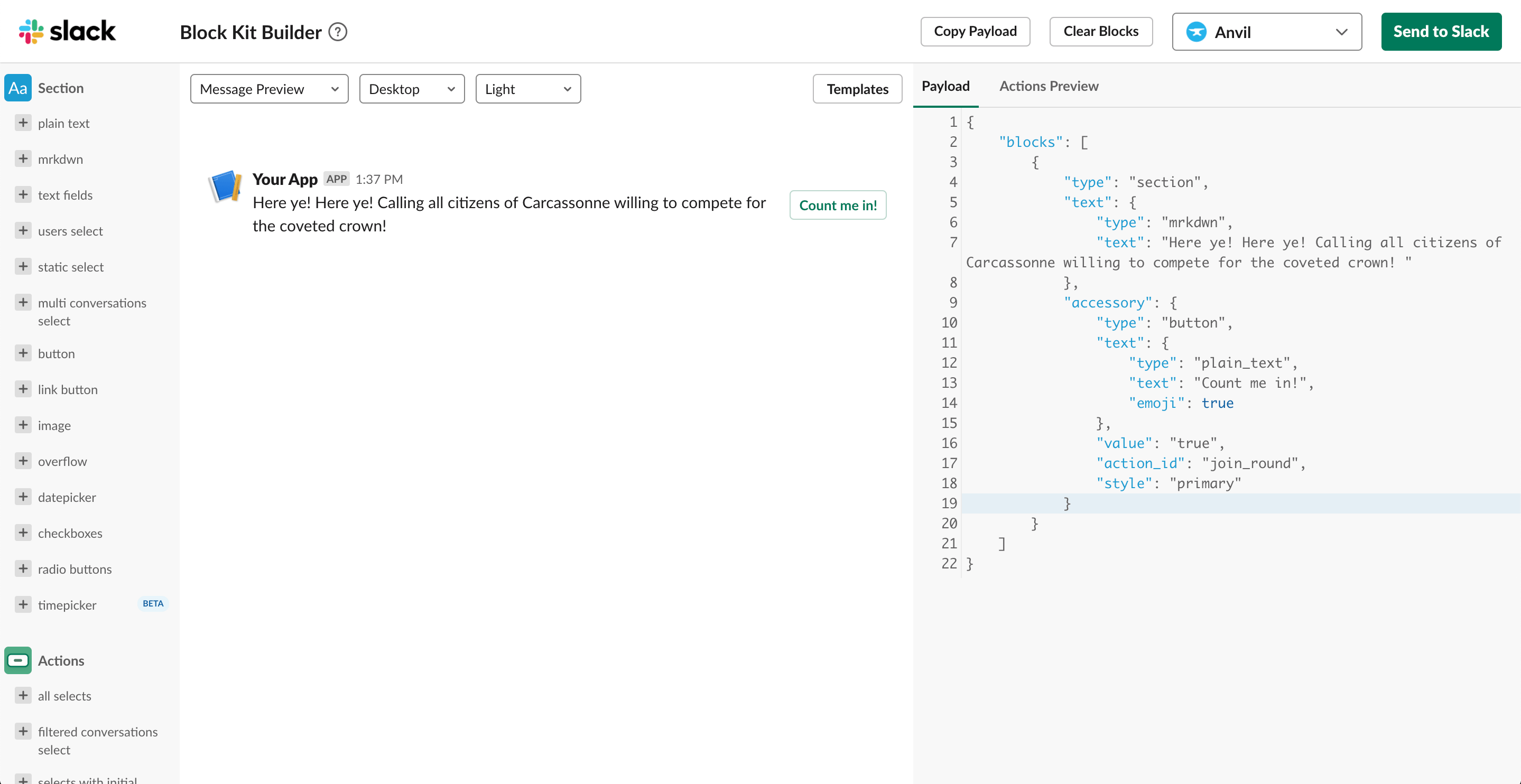 So far, our Slack app still doesn’t do anything. Our Anvil app is set up to handle incoming message and interaction requests, and we’ve set up two Data Tables to store information about our players and games. The next thing we need to do is build our User Interface within Slack. We’ll want the app to announce to Slack that a new round of Carcassonne games are about to start, but we should also ask our co-workers if they want to play this round. As we previously agreed, scheduled fun is the best type of fun, but we can also agree that forced fun is the worst type of fun. So we’ll also need a way for co-workers to opt-in to playing each round.