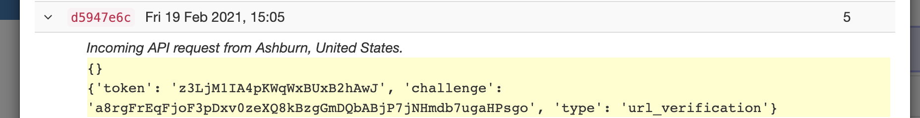 Let’s go back to our app and see what the request looks like in our app and then change our function to return the challenge parameter. In the App Logs, we should see the request that came from Slack and the JSON object printed out. It should look just like Slack said it would.