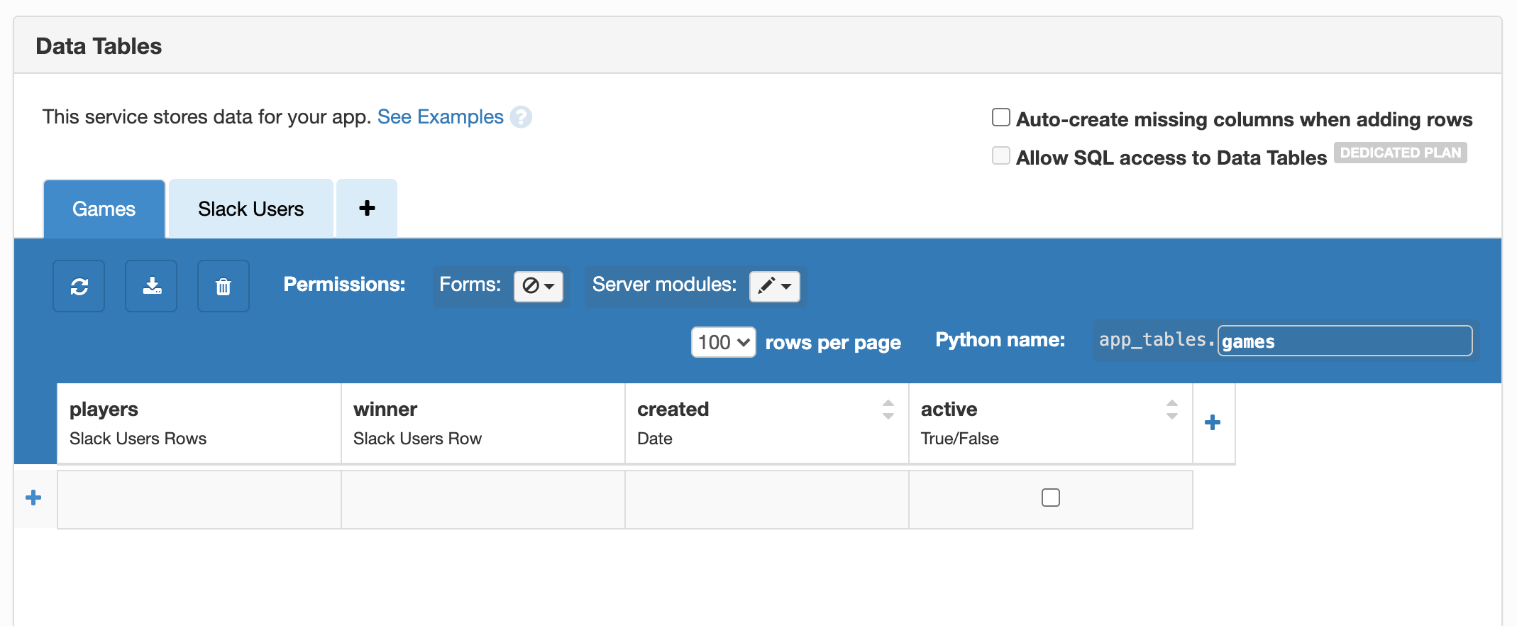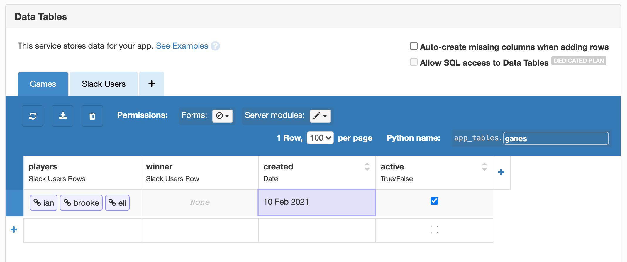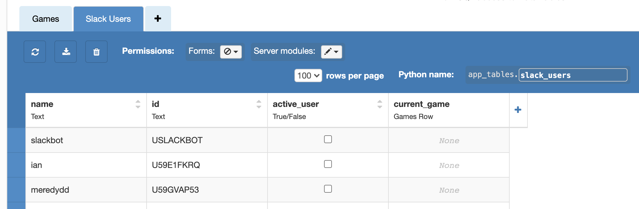 app_tables.slack_users.add_row(name=user['name'], id=user['id'])users_list) aren’t working, make sure you’ve added the required scope(s) to OAuth and Permissions.Create a Data Table for games
