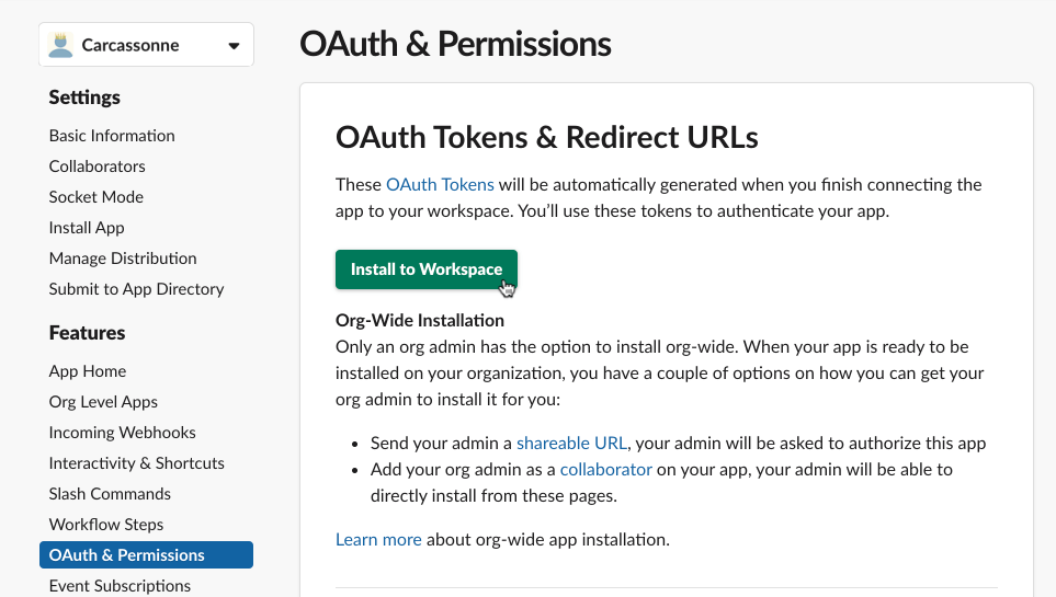 Once you’ve added the scopes (you can always add more later), you’ll be able to install the app to your workspace. Scroll to the top of the page, click the green “Install to Workspace” button and allow the app access to your workspace. You will now have a Bot User OAuth Access Token. Copy this, we’ll need it in a minute.