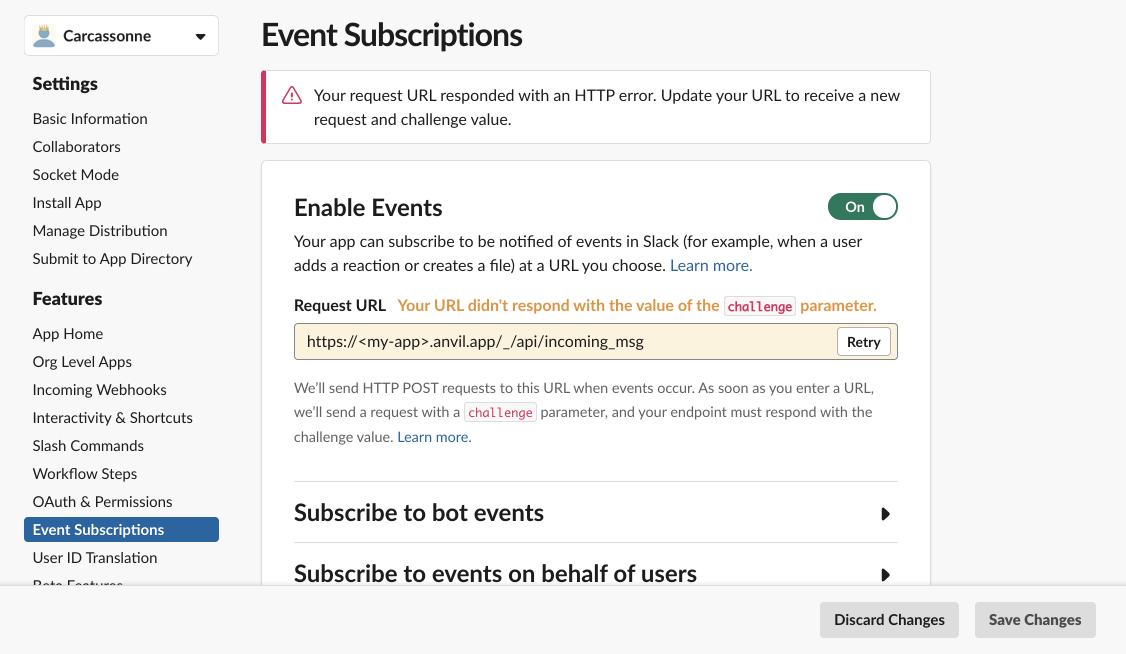 Now we need to go back to the Slack API, and tell it where to send message requests. In the Slack API, click on “Event Subscriptions” in the side bar and toggle “Enable Events” to be on. In “Request URL”, paste your app URL here and add /_/api/incoming_msg (or whatever path you supplied to the HTTP endpoint) to the URL. As it says on that page, Slack is now going to send a request to our URL with a challenge parameter and we need to respond with the challenge value. The request should look like what Slack shows here.