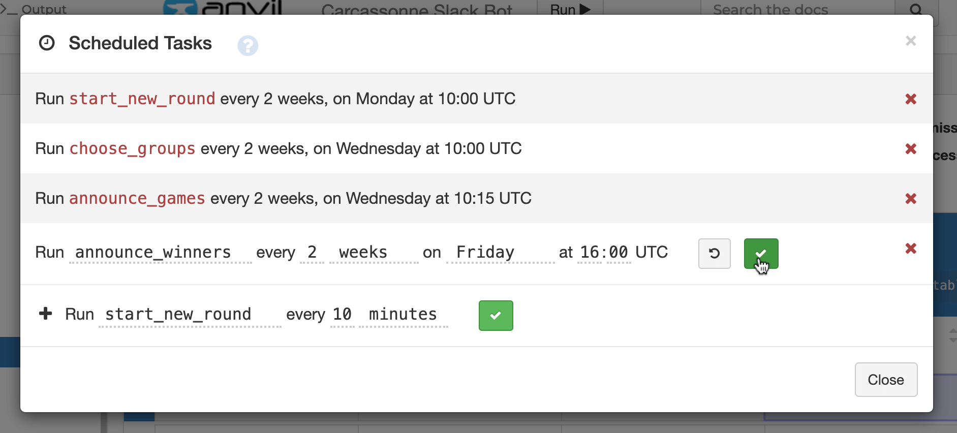 In the Gear menu of your Anvil app, click on Scheduled Tasks. In the popup, add start_new_round as a scheduled tasks and set it to run every 2 weeks (or more or less frequently based on the general level of enthusiasm your team has for Carcassonne). You can then choose what day of the week and the time of the day you want the task to run. Do the same for the other tasks: choose_groups, announce_games, and announce_winners. Make sure to space them out as appropriate.