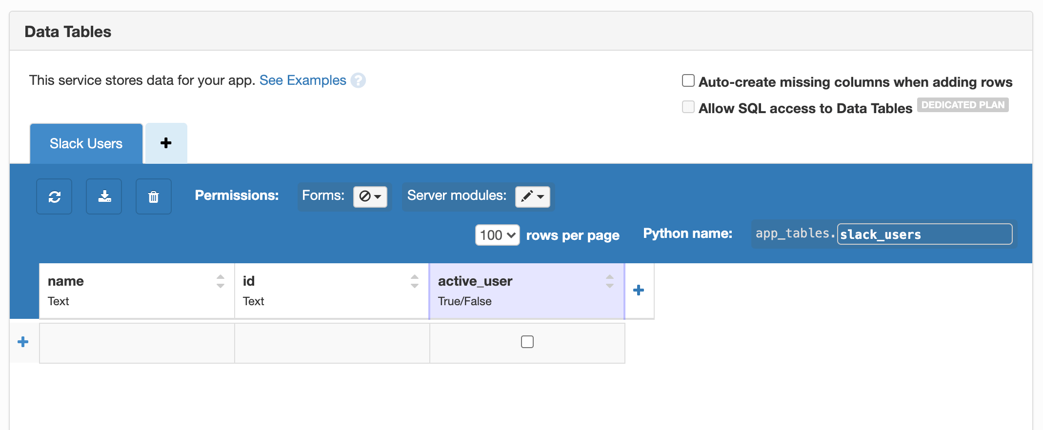 Since we’re building an app to schedule Carcassonne games, the first thing we need is a database of eligible players. Let’s create an empty Data Table with a column for the player’s name, their Slack User ID and a column indicating whether or not they will be playing Carcassonne this round. Let’s name this Data Table slack_users.