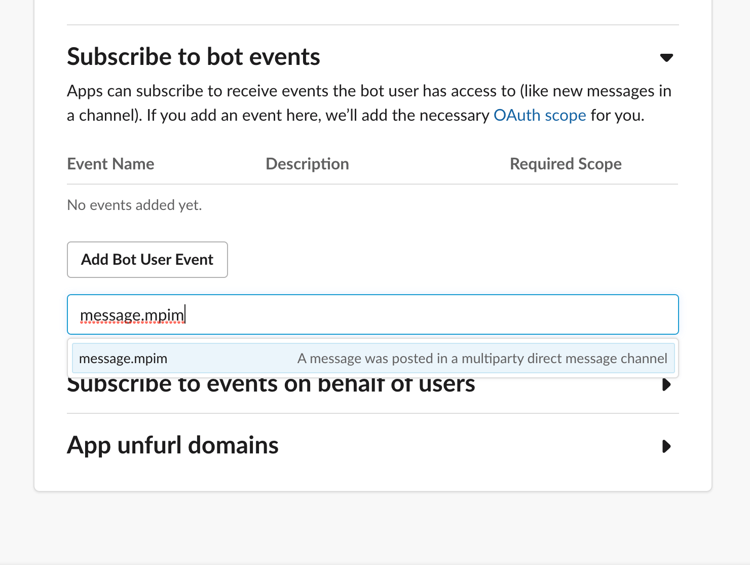 return json['challenge']Go back to “Event Subscriptions” in the Slack API, enable events again and re-add the request URL. This time, the URL should be verified. Without leaving the page, we should now subscribe to bot events. For the Carcassonne app we are building, we only need message.mpim. This allows the app to read messages in a DM - we’ll see later why we want this. Make sure to click “Save Changes” at the bottom of the page and reinstall the slack app to your workspace.