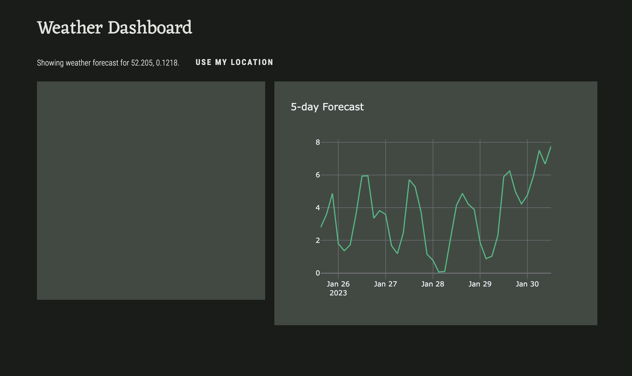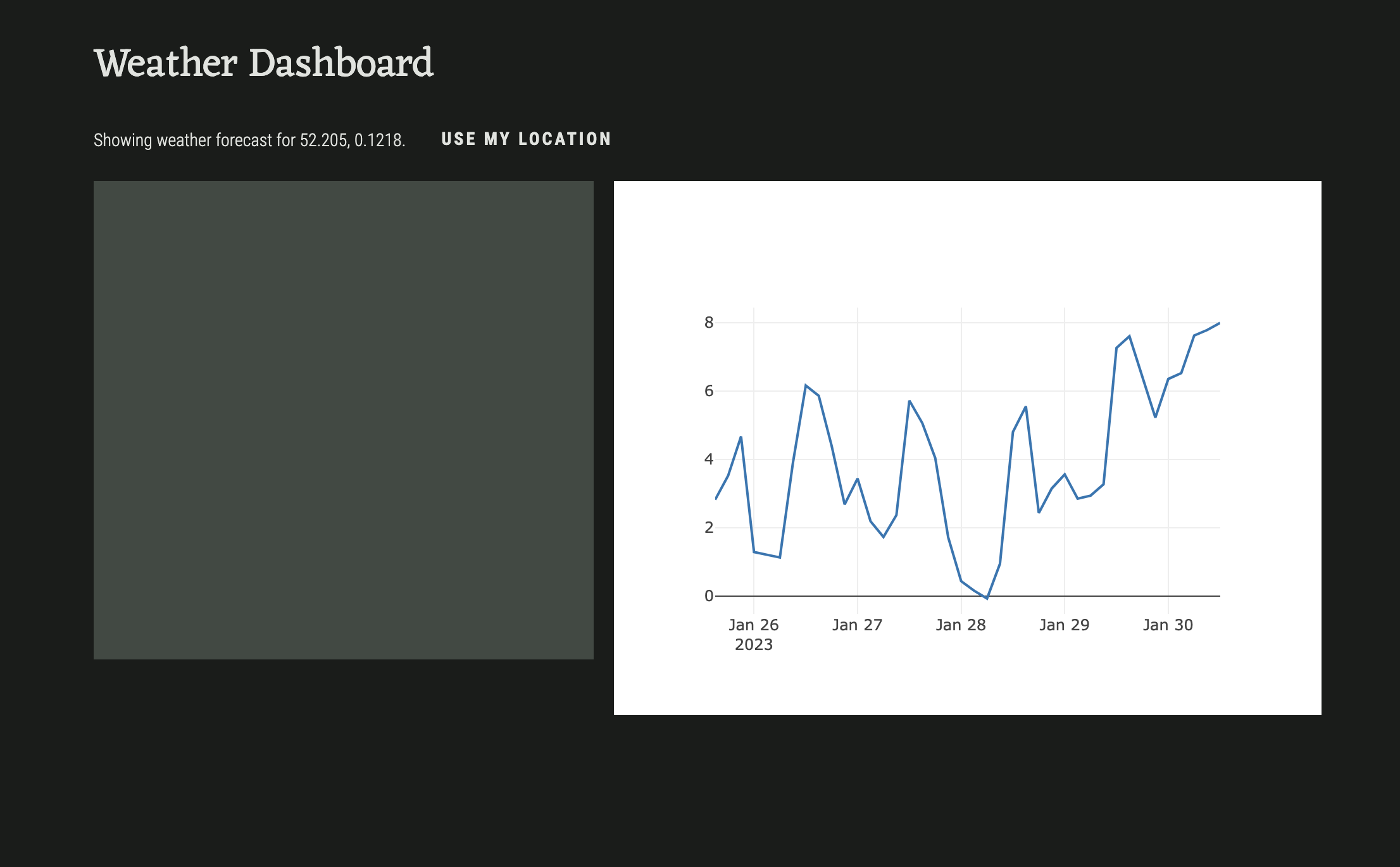 self.plot_1.data = go.Scatter(x=times, y=temps)We’re also going to call this function from set_location, so that every time a location is set, the plot refreshes. This will be useful later, when we display the forecast for the user’s location.