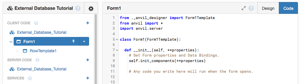 Authenticated OKIn your Anvil app, go to the Code View of Form1.