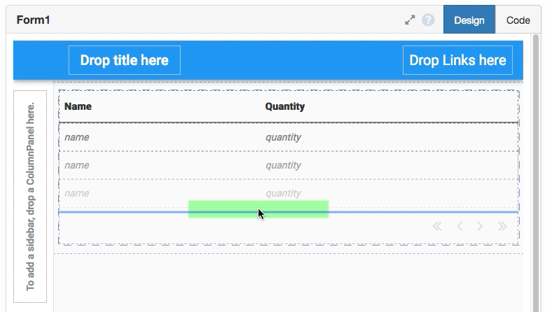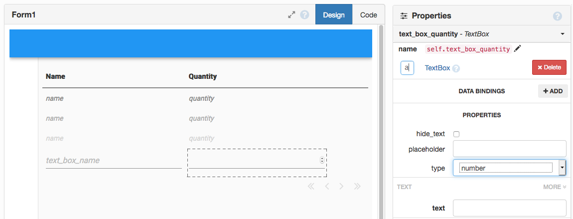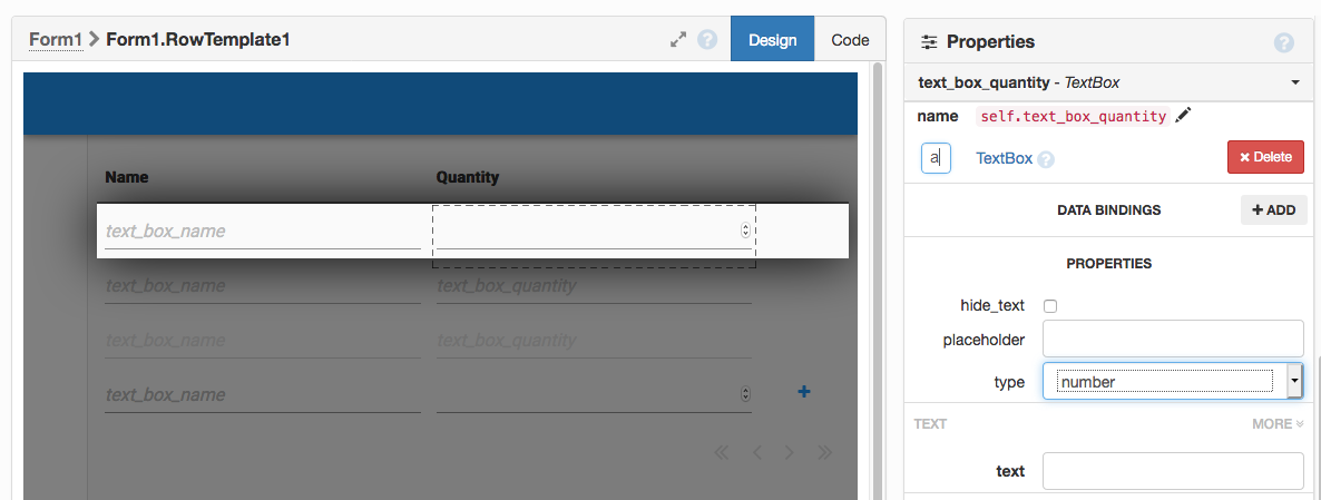Drop a TextBox into each of the Name and Quantity columns. Rename them text_box_name and text_box_quantity. Set the Quantity TextBox’s type to number.