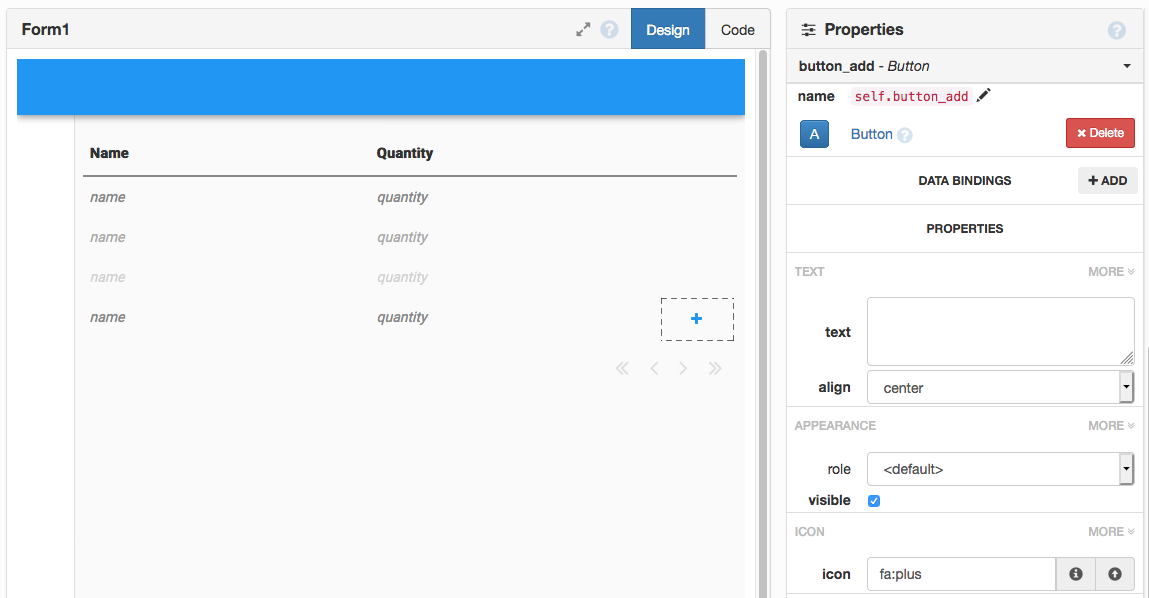 Drop a Button into the end column. Rename it button_add. Clear the Button’s text and set its icon to fa:plus.
