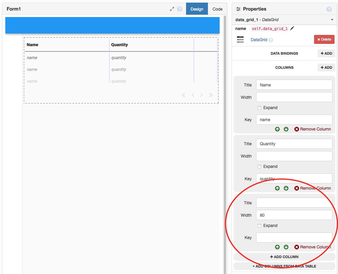 Add a column to your Data Grid. Clear its Title and Key. Set its width to 80. This will hold our ‘add’ button later.
