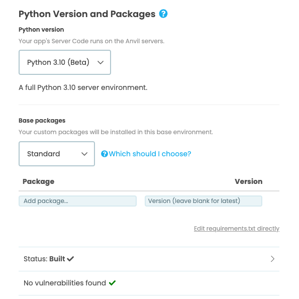 First, we’re gonna need to install Pandas into our app. Go to Settings, click on Python versions and select Python 3.10 (Beta) from the Python version dropdown. Pandas is included as part of the Standard base environment, so we’ll go ahead and select it from the Base packages dropdown. This is how your Python Version and Packages page should look like: