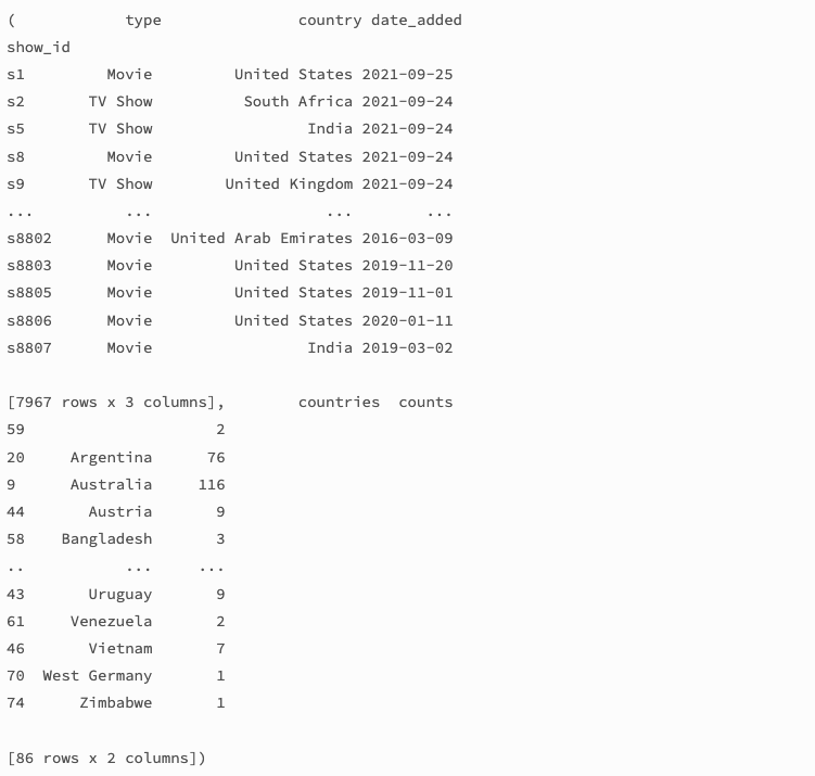 return netflix_df, country_countsFinally, we can print the output of prepare_netflix_data inside our explore function, to make sure everything looks right.